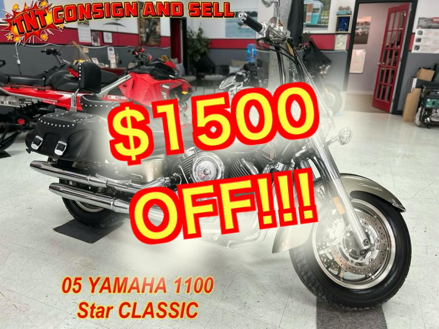 Folks have a look at the stunning two tone 2005 Yamaha V star classic. It has just over 18,000 km, this 1100 cc motorcycle features windshield, studded back rest seat and leather bags, highway bars, floorboards front and rear. This bike shows in absolutely excellent condition. At $4999 (((NOW $3499)) finances as low as $52 biweekly everything included at 4.99% over 48 months with approved credit. Subprime financing available to those rebuilding credit. For more details please call the store at 489–7653. Thank you for looking.