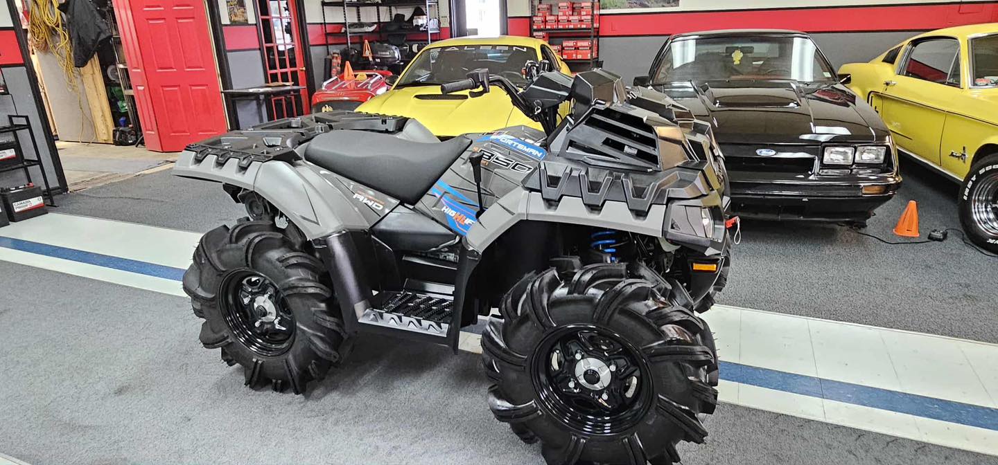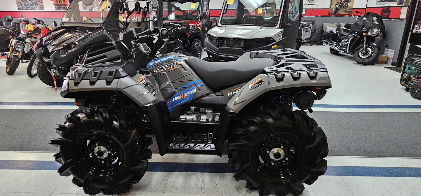 The 2024 Polaris Sportsman 850 High Lifter has a ProStar 850cc, 78-HP engine, a 13.5-inch ground clearance, and 30-inch Outlaw 2 tires, with a 1,500-pound towing capacity. It features a high-clearance arched dual A-arm front and rear suspension, a True On-Demand AWD/2WD drive system, and a sealed rear storage compartment.
